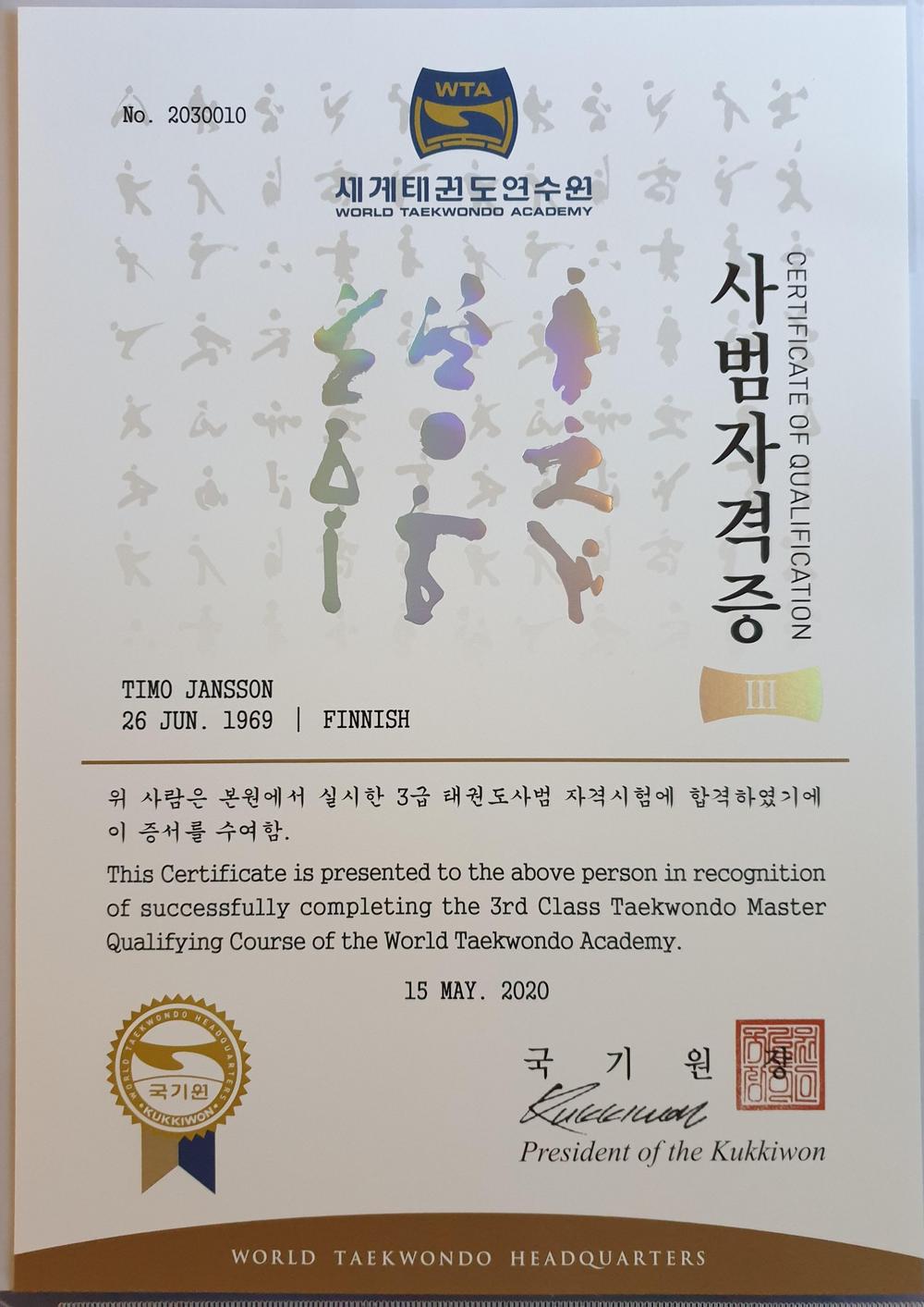 World Taekwondo Academy Master certificate Timo Janssonille